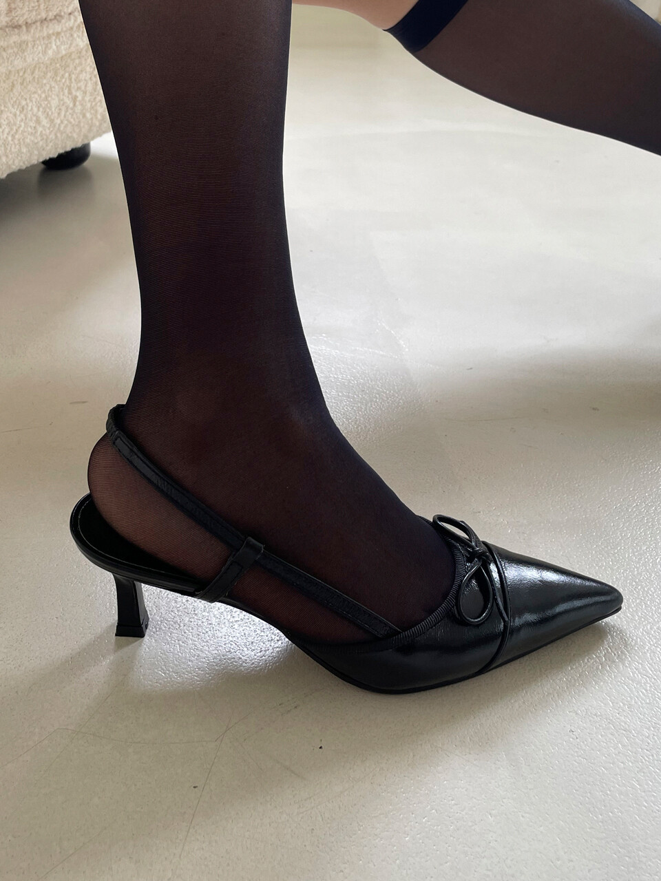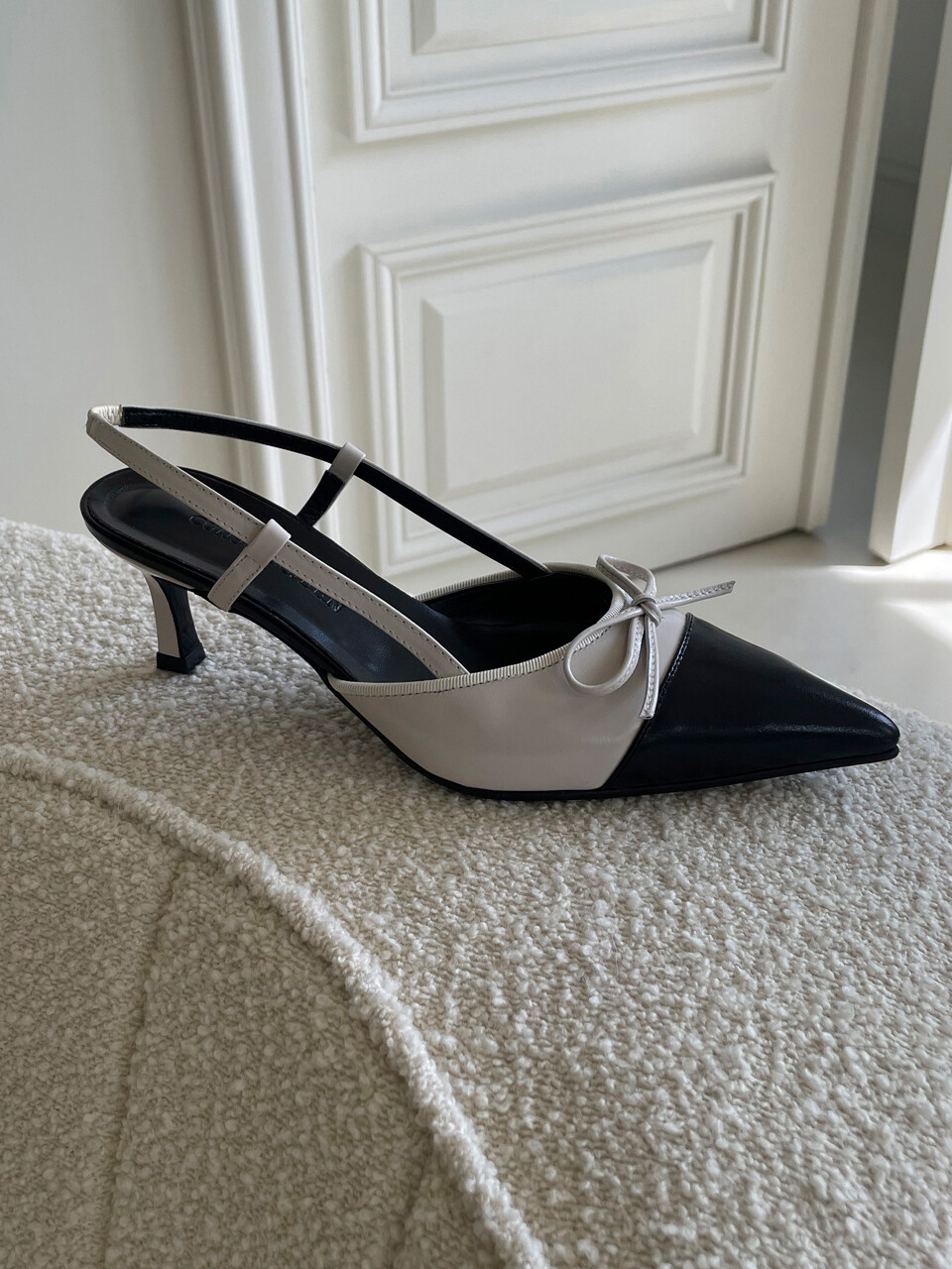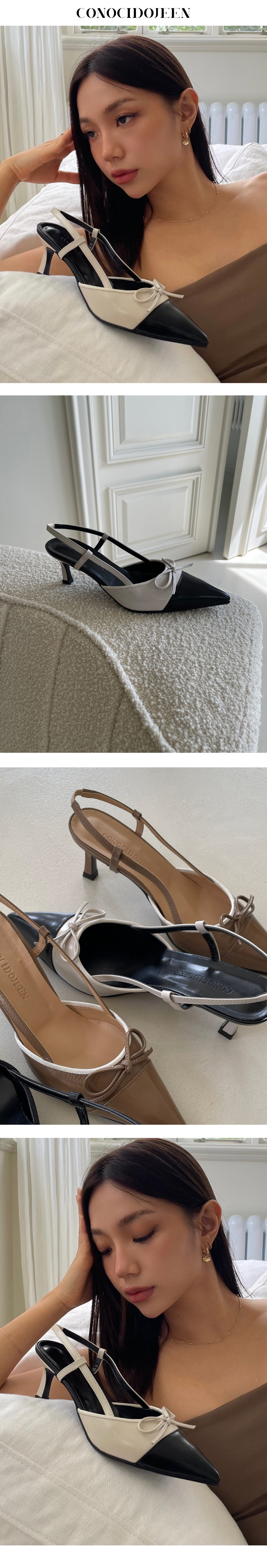 +Shoes Story코노시도진 디자이너가 직접개발한 라스트 디자인으로 옆라인이 돋보이면서앞코가 포인트되어 다리가 길어보이는 디자인입니다.앞코 절개라인이 들어가 엣지있는 형태의 디자인으로 매력이 있으며,리본디자인으로 클래식함을 잃지 않고 있는 슬링백 디자인입니다.